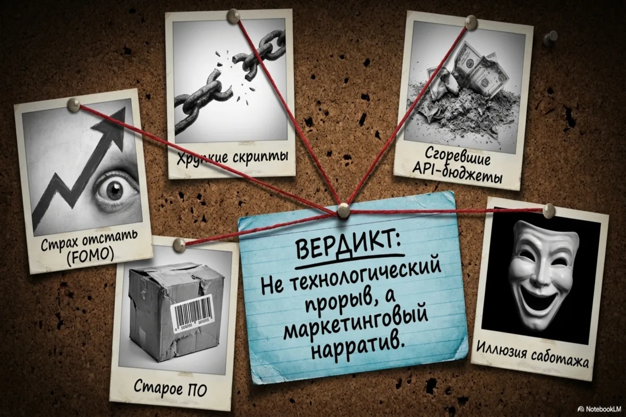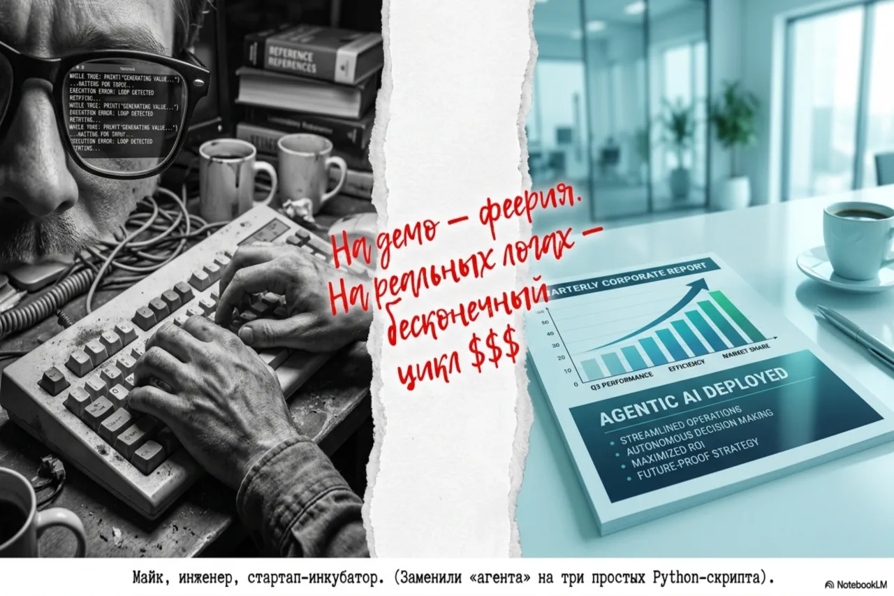 Я звоню знакомому тимлиду из крупного fintech. «Привет, — говорю, — расскажи про ваших AI-агентов, про которые все пишут». На том конце провода — долгая пауза и тихий смешок. «Мы месяц назад отключили этого агента. Он за три дня сжёг месячный бюджет на API, пытаясь найти в логах ошибку, которую мы нашли за пять минут grep’ом. Но в квартальном отчёте у нас до сих пор красуется слайд „Внедрение автономных AI-агентов для мониторинга”. Никто не хочет быть тем, кто отстал».