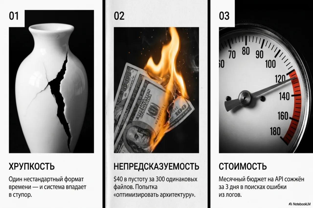 Три кита провала. Хрупкость, непредсказуемость и высокая стоимость API делают агентов нежизнеспособными для реальных задач без human-in-the-loop.