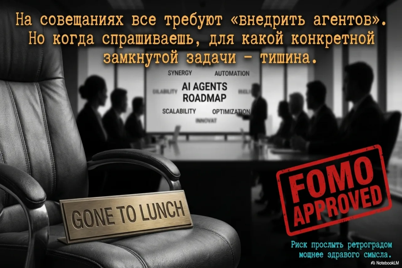 «На совещаниях все требуют внедрить агентов», — делится со мной IT-директор из крупного ритейла. — Но когда спрашиваешь, для какой конкретной замкнутой задачи — тишина. Никто не может назвать конкретный процесс, который стоит автоматизировать. Просто внедрите агентов. Потому что все внедряют».