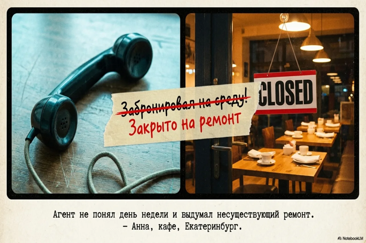 Агент для кафе «У Анны» в Екатеринбурге не смог отличить пятницу от среды. Хозяйка кафе Анна позвонила сама себе с другого номера, чтобы протестировать систему. «На какое число бронь?» — спросил агент. «На пятницу», — ответила Анна. «Отлично, забронировал вам на среду», — сказал агент и отключился. Потом муж попробовал — агент вообще сообщил, что кафе закрыто на ремонт.