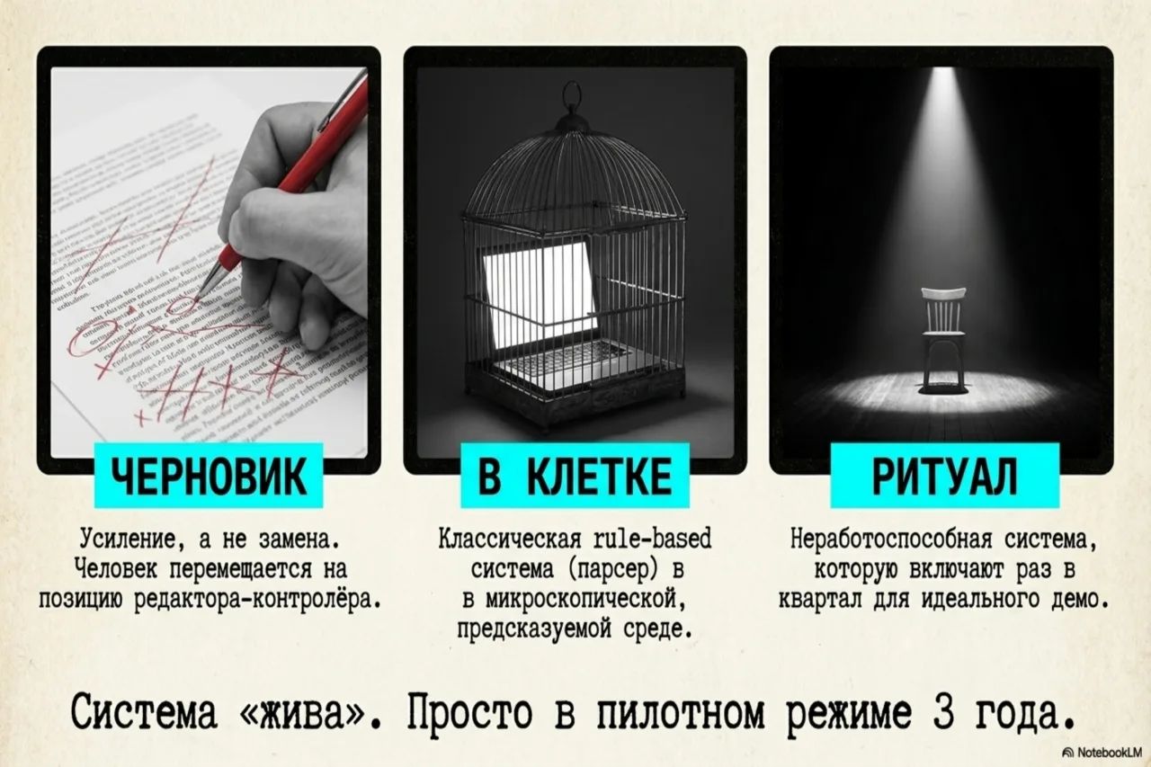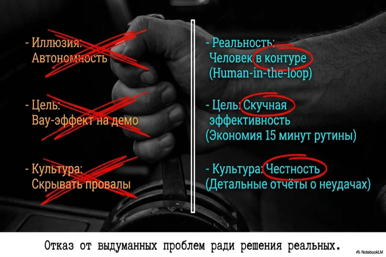 Это создаёт порочный круг самообмана. Разработчик на местах знает, что его творение — хрупкий костыль. Но он не может сказать об этом боссу, который уже пообещал инвесторам «прорывную автономию». Босс не может сказать инвесторам, что «прорыв» сгорел в бесконечных циклах API-запросов. Все делают вид, что работа идёт, есть некоторые сложности, мы в пилотном этапе. А в это время втихую заменяют «агента» на старый добрый скрипт.
